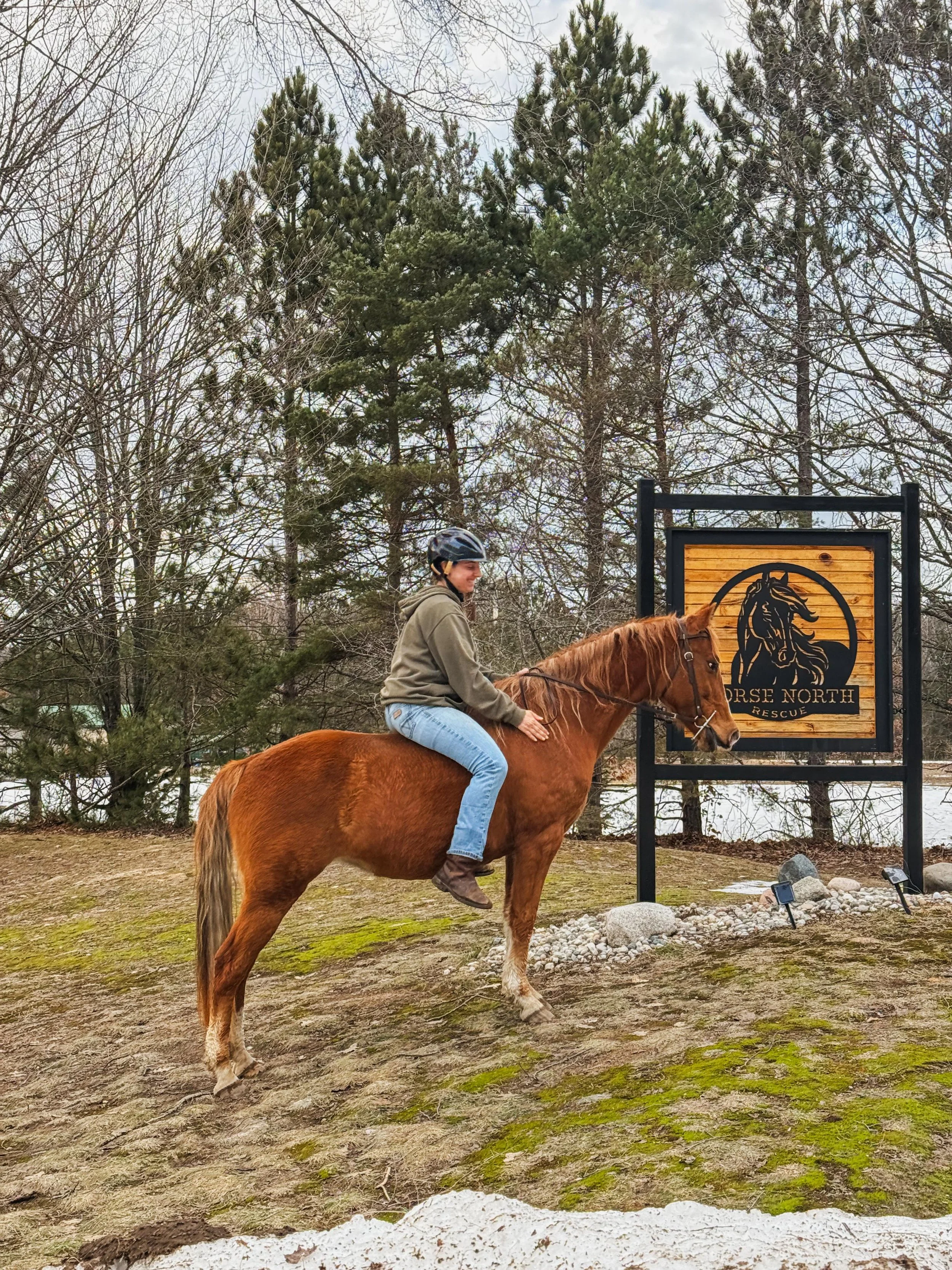 Continuing saddle training: Hunter was not started under saddle before coming to Horse North Rescue, but he has completed 30 days of riding work and continues to learn under saddle at the walk. We would class him as a project horse for an intermediate or advanced rider